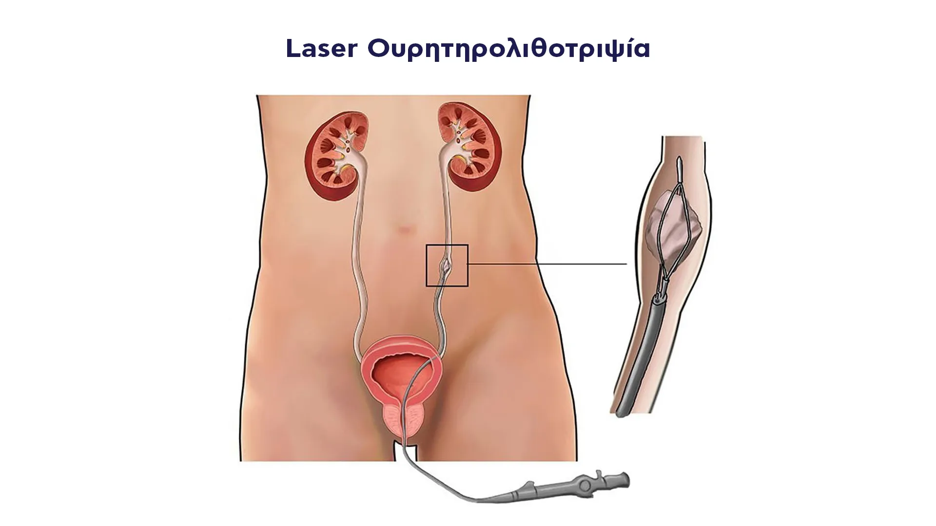 - Ένα λεπτό ουρητηροσκόπιο εισάγεται μέσω της ουρήθρας στον ουρητήρα υπο γενικη ανιαθησια.